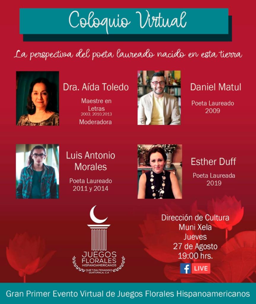 “Se tendrá una primera actividad el próximo 27 de agosto a las 19:00 Hrs en la Fan Page de la Casa de La Cultura , se trata de un coloquio virtual con ganadores de Juegos Florales Hispanoamericanos oriundos de Quetzaltenango”, detalló Rojas.