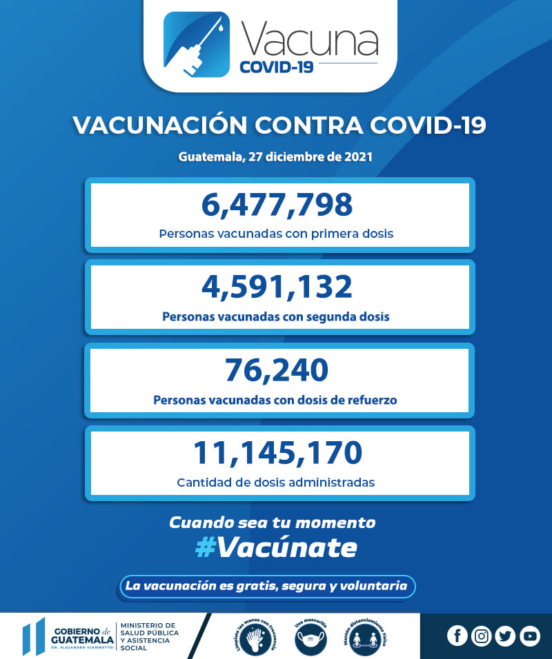 El Ministerio de Salud Pública y Asistencia Social (MSPAS) informa la cantidad de personas que han recibido la primera dosis y el esquema completo de la vacuna contra el COVID-19, hasta este 26 de diciembre de 2021.
