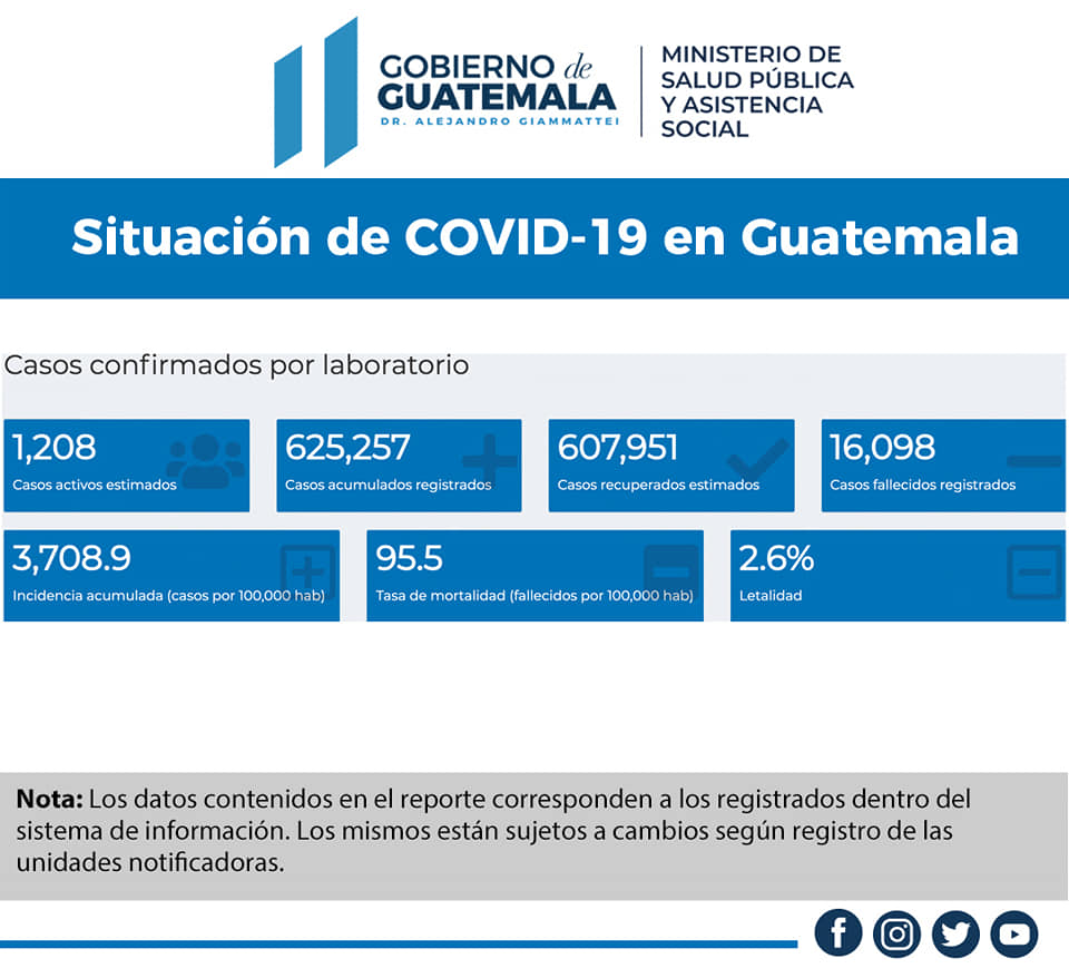 El MSPAS también informa este 27 de diciembre de 2021 sobre los casos confirmados por laboratorio en el tablero Situación COVID-19 en Guatemala, durante las 24 horas recientes.