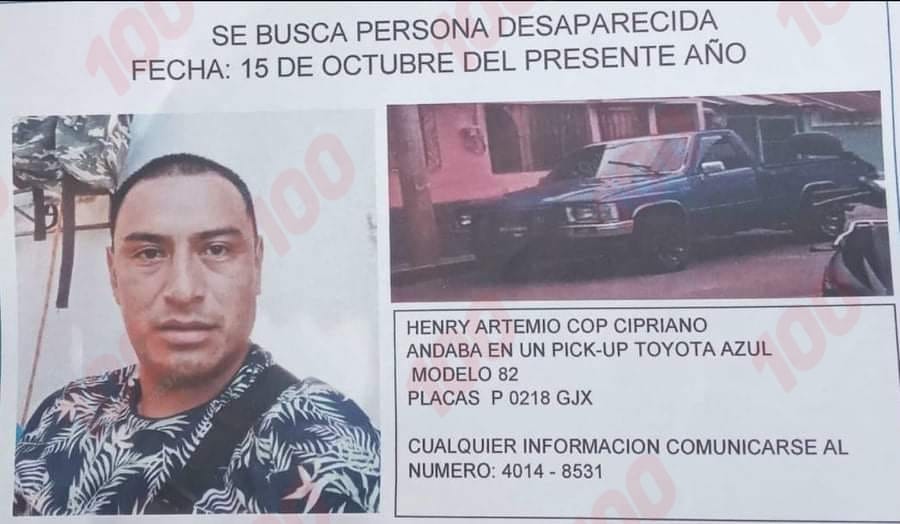 Familiares y amigos emitieron alerta para hallar el paradero de Henry Artemio Cop Cipriano, de 37 años de edad, quien despareció el pasado viernes 15 de octubre y fue visto por última vez en Cuyotenango, Suchitepéquez. Él es originario de San Isidro, Olintepeque, Quetzaltenango.
