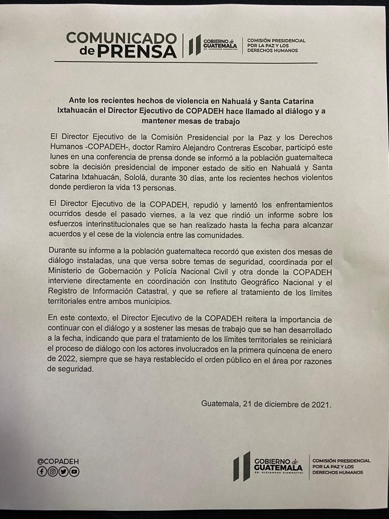 Entre los puntos acordados están reforzar la seguridad en Santa Catarina Ixtahuacán y en Nahualá, donde se han registrado enfrentamientos por conflictos territoriales.