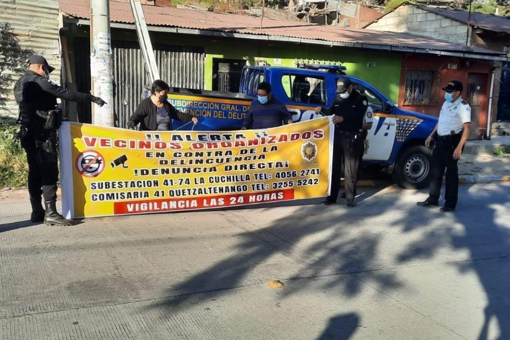 Agentes de la comisaría 41 y vecinos en la zona 9 de Quetzaltenango, instalan pancartas vinílicas con los números de teléfono locales, con la finalidad de fomentar la cultura de denuncia; se instalaron 4 matas también puede llamar al 110 y 1561 a nivel nacional.