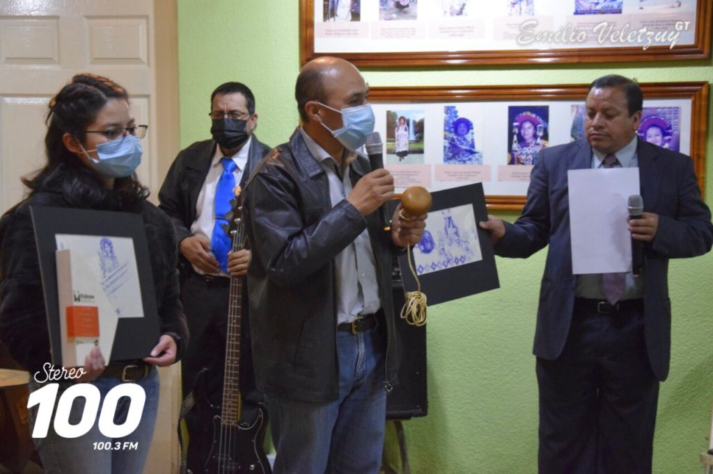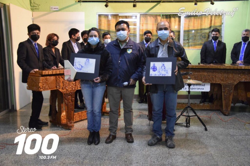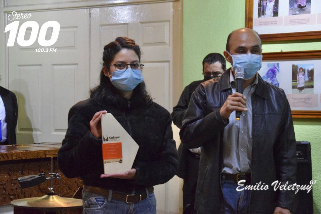 En un acto que se desarrolló en las instalaciones del Centro Cultural de La Esperanza, Quetzaltenango, entregan un reconocimiento a Marco Antonio Alvarado y a Ana Mateo, quienes en fecha reciente lograron el primer lugar del certamen nacional Kakaw Innovación, Artesanía y Diseño 2021.