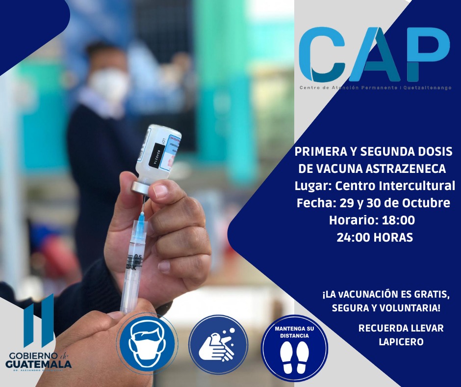 El Centro de Atención Permanente de Quetzaltenango dio a conocer los puestos de vacunación para este 30 y 31 de octubre y 1 de noviembre, que habilitará uno por el asueto del Día Todos Los Santos.