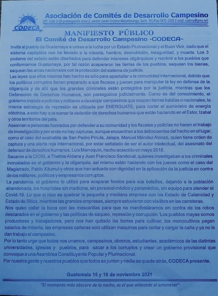 Las manifestaciones se realizan como protesta al aumento en el costo de los productos de la canasta básica y energía eléctrica y coordinadas por el el Comité de Desarrollo Campesino (CODECA).