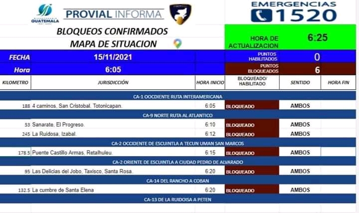 La más reciente actualización de PROVIAL, sobre los puntos bloqueados en el país: