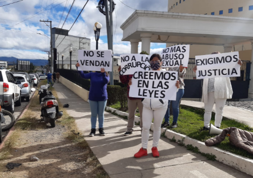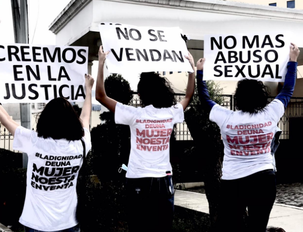 «La dignidad de una mujer no está en venta», «Creemos en la justicia» y «No más abuso sexual» son algunos mensajes colocados en carteles y plasmados en blusas de las personas que protestan.