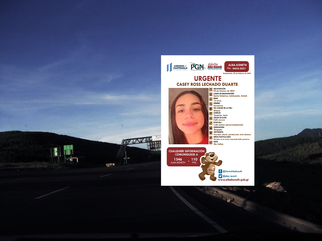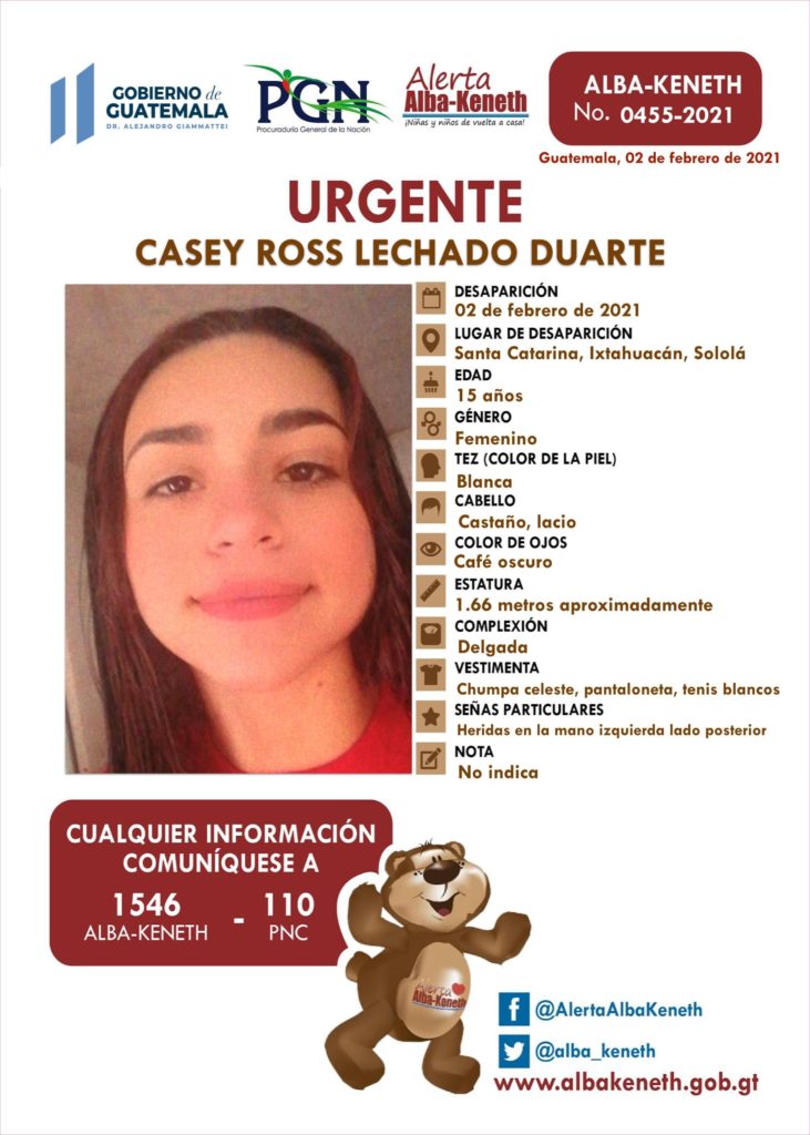 Alerta Alba Keneth por la desaparición de Casey Ross Lechado Duarte, de 15 años de edad, en el municipio de Santa Catarina Ixtahuacán, Sololá. Es originaria del municipio de Palo Blanco, Escuintla y actualmente residía en san Francisco el Alto Totonicapán.