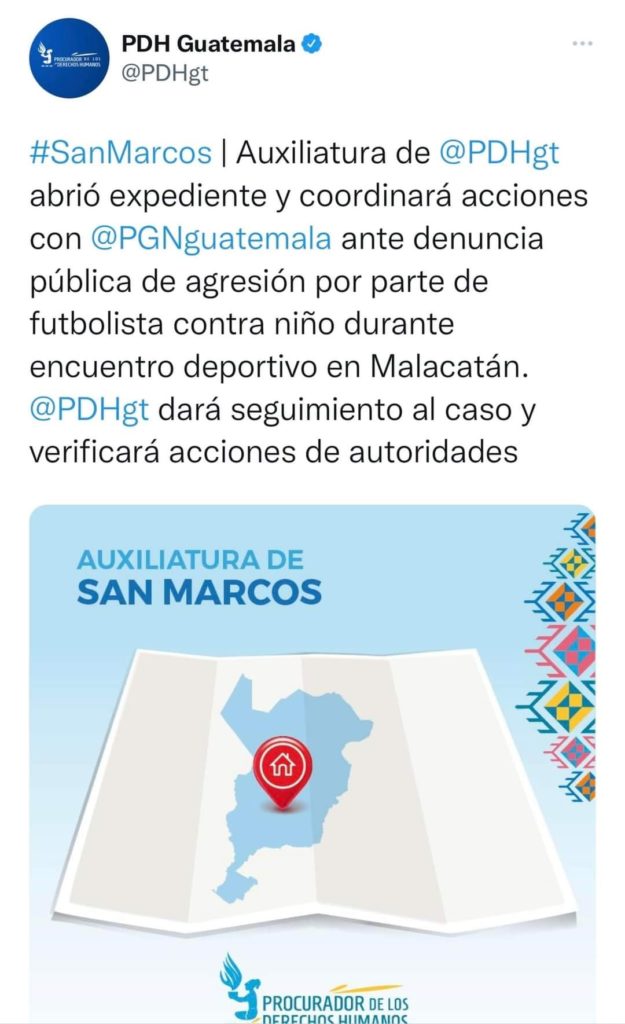 La Procuraduría de los Derechos Humanos (PDH) abrirá expediente por la acción del guardameta de Comunicaciones FC, Kevin Moscoso, que empujó a joven que alcanzaba balones durante el partido de ida de la final del Torneo Apertura 2021 en la Liga Mayor del Fútbol de Guatemala, ayer en el estadio Santa Lucía de Malacatán San Marcos.