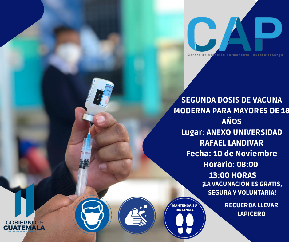- Segunda dosis de la vacuna Moderna, para mayores de 18 años de edad, en el anexo de Universidad Rafael Landívar, de 08.00 a 13.00 horas.
