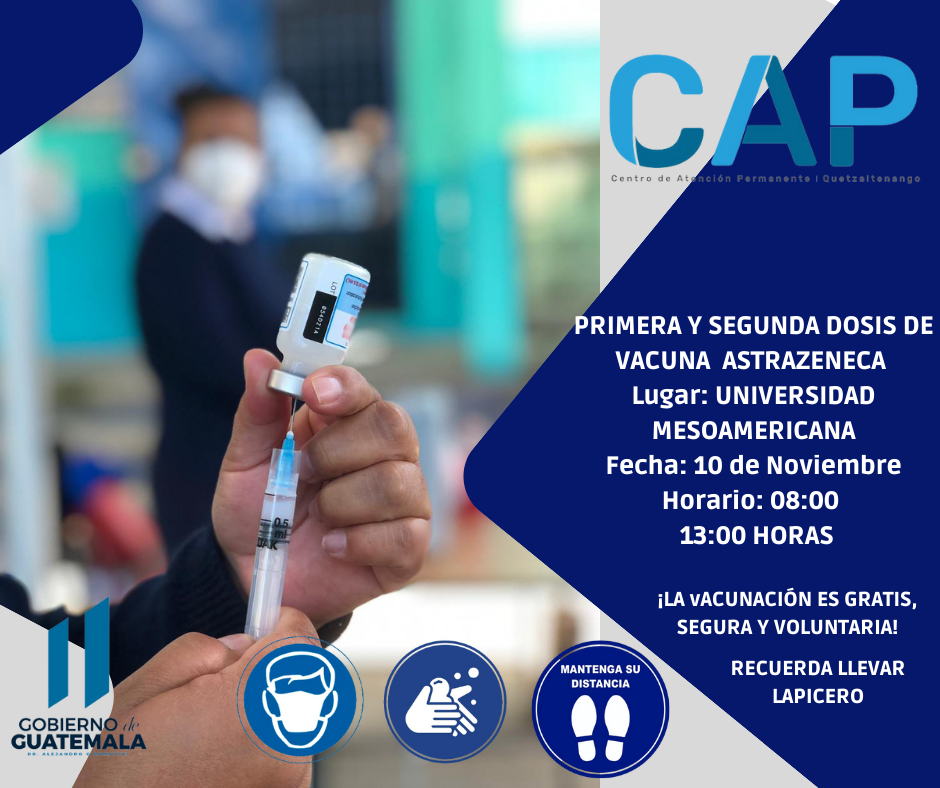 - Primera y segunda dosis de la vacuna Astra Zeneca, para mayores de 18 años de edad, en la Universidad Mesoamericana, campus de Avenida Las Américas. de 08.00 a 13.00 horas.