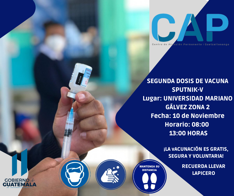 - Segunda dosis de la vacuna Sputnik-V, en la Universidad Mariano Gálvez, zona 2 de la ciudad de Quetzaltenango, de 08.00 a 13.00 horas.