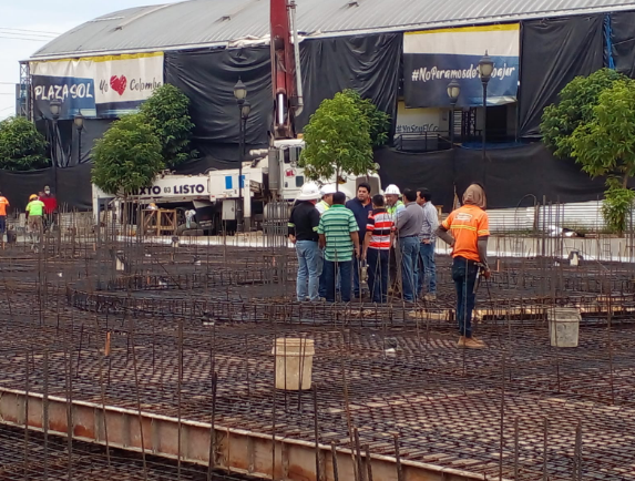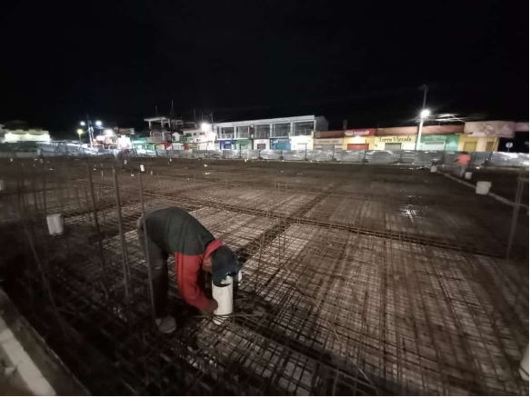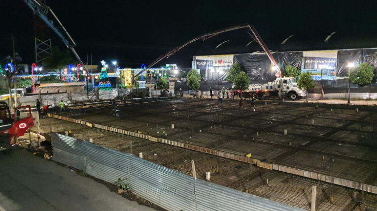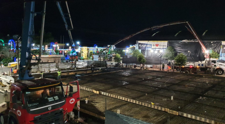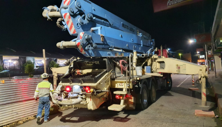 Este martes se desarrolla la fundición de una losa de 1 mil 830 metros para la construcción de un parqueo subterráneo, en el centro de Colomba Costa Cuca, Quetzaltenango.