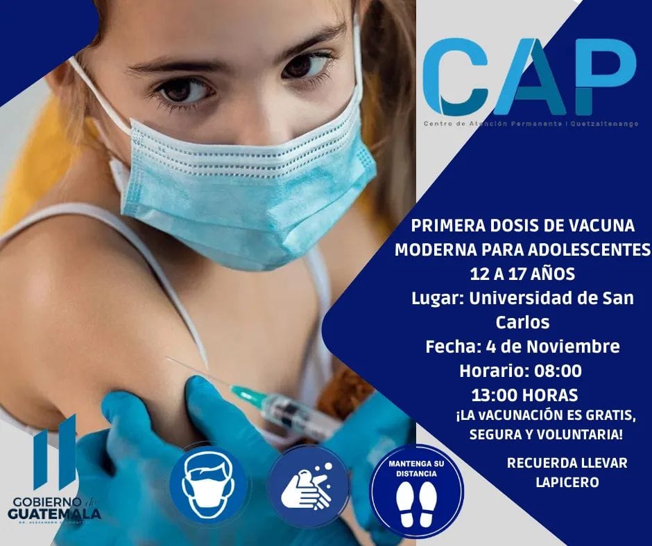 – Puesto de vacunación para adolescentes, también sólo para este 04 de noviembre (por cantidad de dosis disponibles), aplicaron vacuna Moderna en el Centro Universitario de Occidente (CUNOC), de 08:00 a 13:00 horas. Es importante llevar certificado de nacimiento reciente del menor (en original y copia), deben estar inscritos en www.vacuna.gob.gt con anticipación de 3 días mínimo. La persona adulta, responsable del menor, debe llevar fotocopia de DPI (una por cada adolescente a vacunar).
