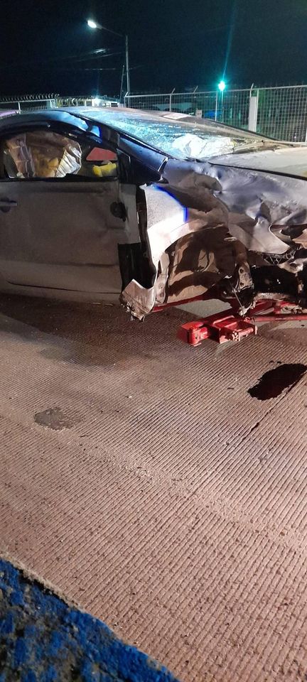 Testigos refieren que dos jóvenes se conducían en el vehículo accidentado y que un guardia de seguridad privado que se encontraba en el lugar, se salvó de ser arrollado por el automotor.