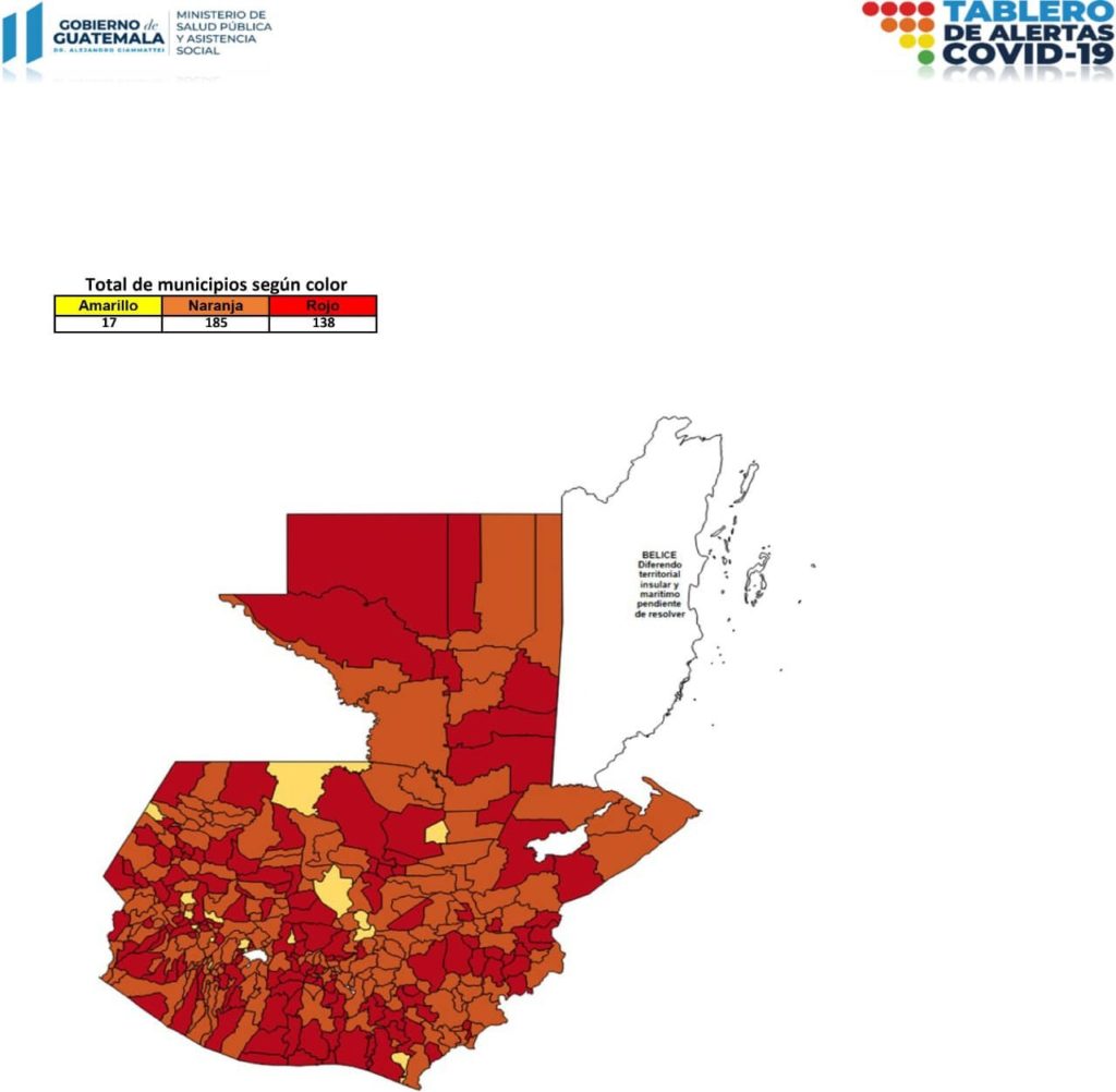 El Ministerio de Salud Pública y Asistencia Social -MSPAS- actualizó el Tablero de Alertas Sanitarias COVID-19; para los próximos 14 días se establecieron 138 municipios en alerta roja, 185 en naranja y 17 en amarilla.