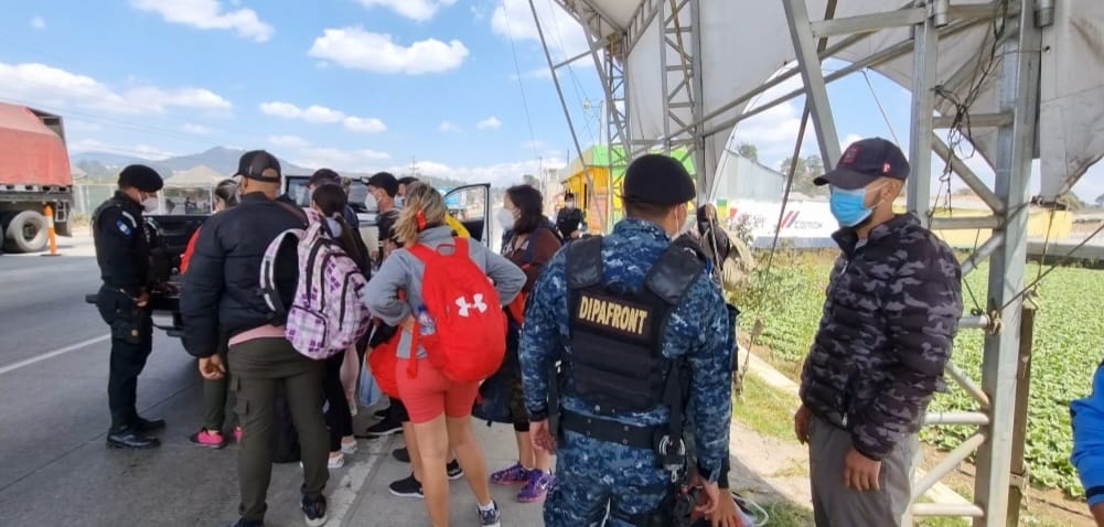 En un puesto vehicular ubicado en el kilómetro 75.4 de la ruta Interamericana, a inmediaciones de Patzicía, Chimaltenango, policías de #DIPAFRONT de la Policía Nacional Civil (PNC) le marcaron el alto al bus C-803BBS de los transportes Guadalupana donde viajaban 19 centroamericanos, al identificarlos y solicitarles el ticket de ingreso al país, el cual es extendido por Migración, manifestaron que no habían realizado ningún trámite, por tal situación fueron llevados a la Dirección General de Migración para las diligencias correspondientes.
