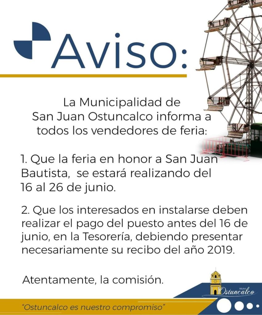 La Municipalidad de San Juan Ostuncalco comunicó a finales de mayo reciente que la feria titular en honor a San Juan Bautista se realizará de 16 al 26 de junio. La comuna convocó a los vendedores que se instalan todos los años durante esta época.