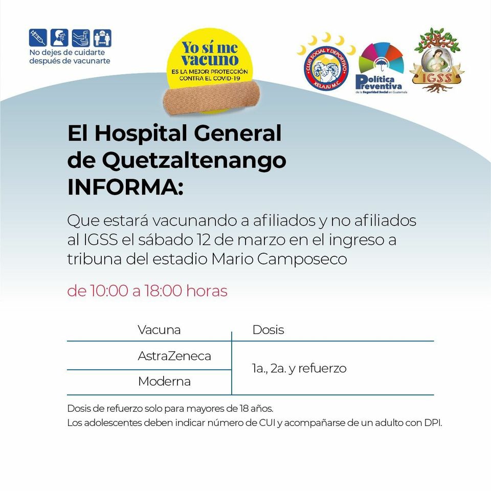 Además, el IGSS, a las 10.00 horas instalará puesto de vacunación frente al ingreso de tribuna del Estadio Mario Camposeco en la zona 3 altense.