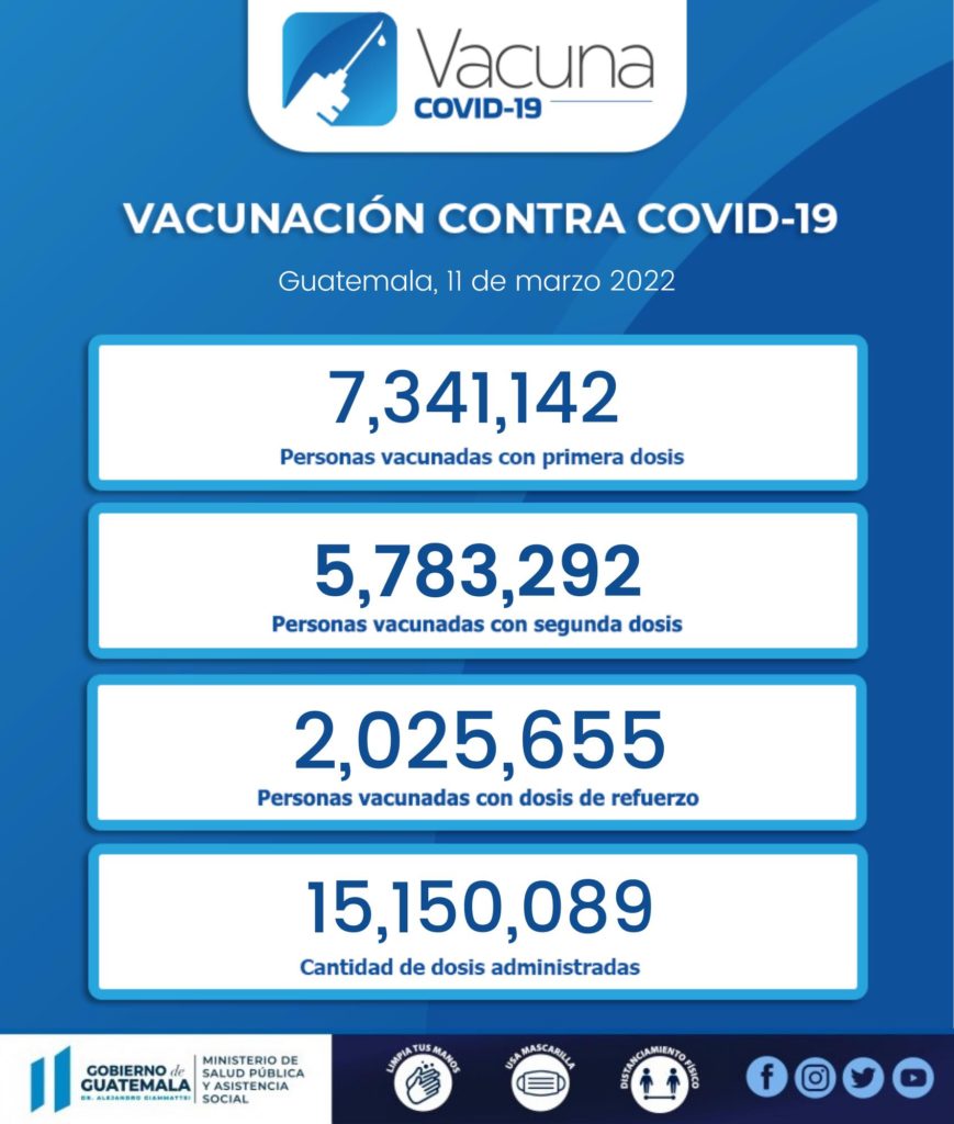 El Ministerio de Salud Pública y Asistencia Social (MSPAS) informa la cantidad de personas que han recibido la primera dosis y el esquema completo de la vacuna contra el COVID-19 a nivel nacional, dato actualizado hasta el 11 de marzo de 2022.