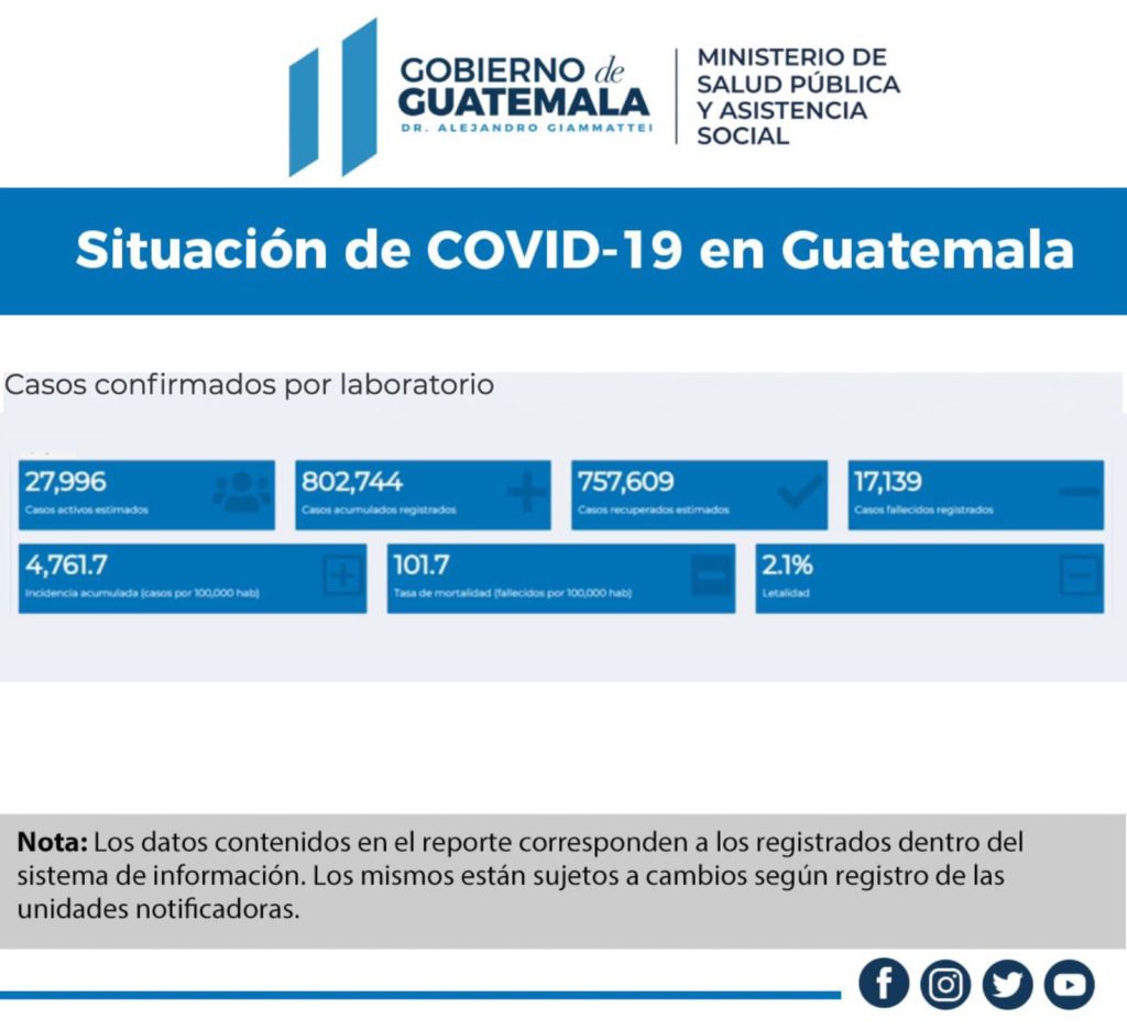 La cartera de Salud también informó este 11 de marzo de 2022 los casos confirmados por laboratorio en el tablero Situación COVID-19 en Guatemala.