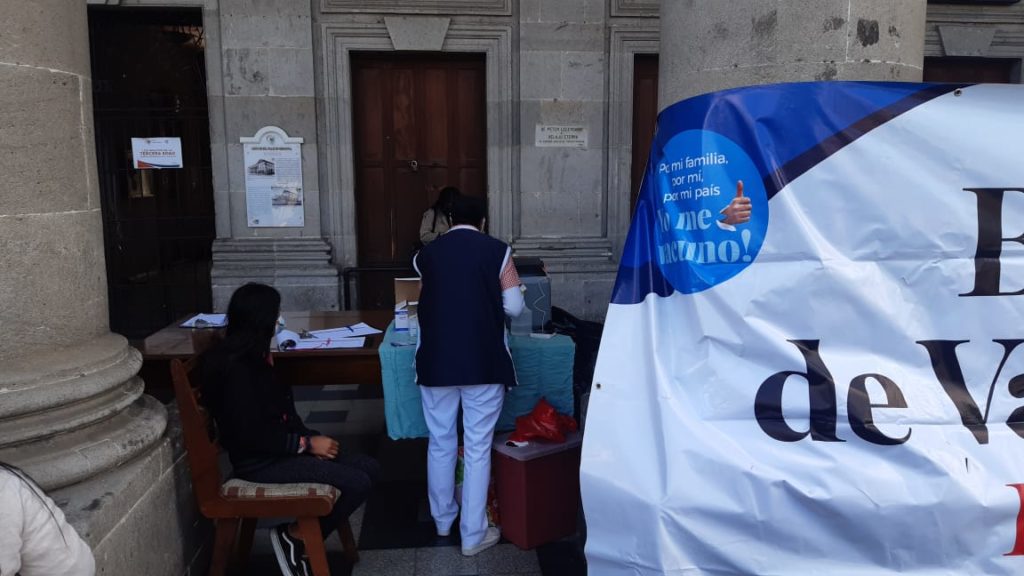 Brigada del Institugo Guatemalteco de Seguridad Social (IGSS) de Quetzaltenango, instala puesto de vacunación contra el Coronavirus COVID-19 en el frontispicio del edificio municipal.