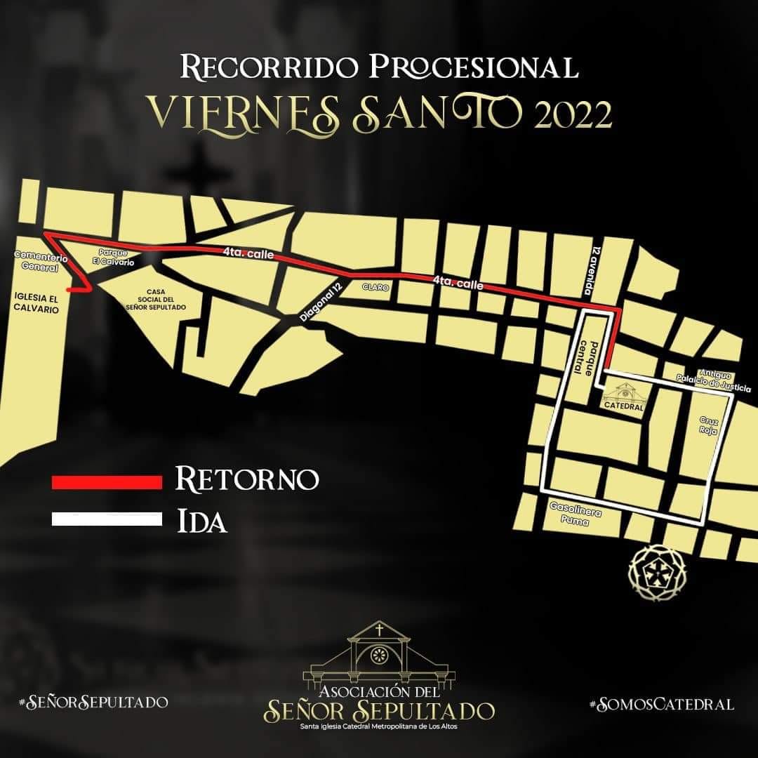- A las 16.30 de la tarde sale el Santo Entierro, Señor Sepultado de Catedral Metropolitana de Los Altos. Coronará el parque central, pasará por el Centro Histórico, se enfilará por la 4a. Calle de la zona 1 y finalizará en la Parroquia Nuestra Señora de la Soledad, El Calvario.