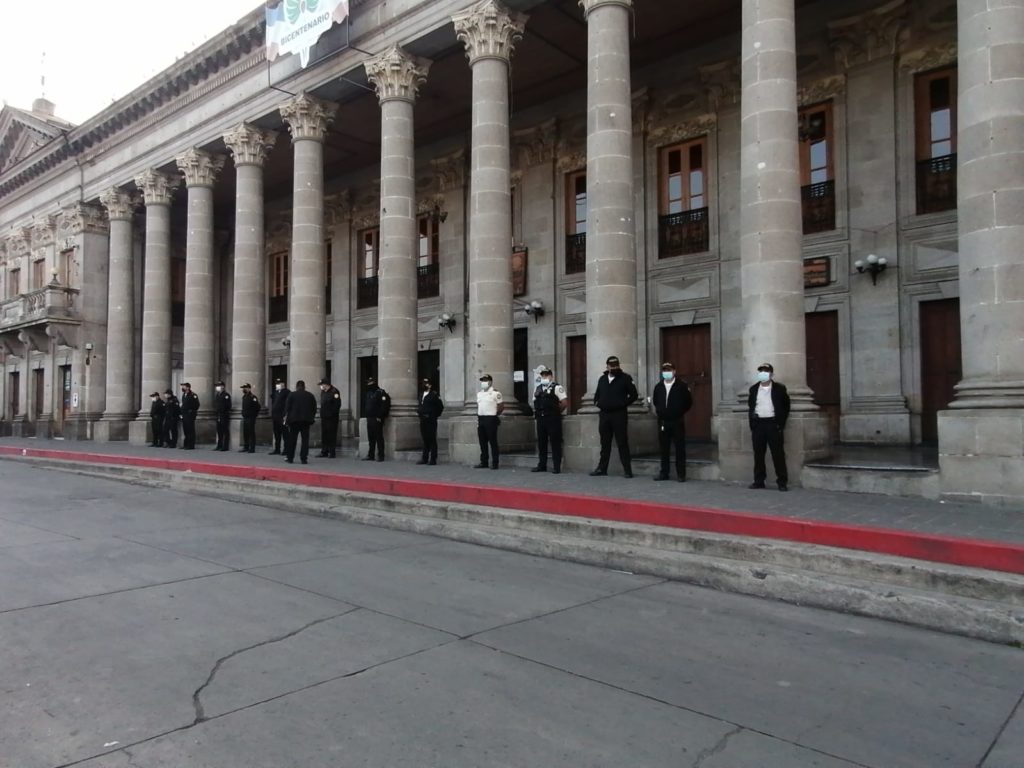 Elementos de la Policía Nacional Civil (PNC) resguardan la Municipalidad de Quetzaltenango, se espera la llegada de vecinos del Valle del Palajunoj que serán recibidos hoy por el alcalde Juan Fernando López. En relación a la problemática con el Plan de Ordenamiento Territorial (POT).