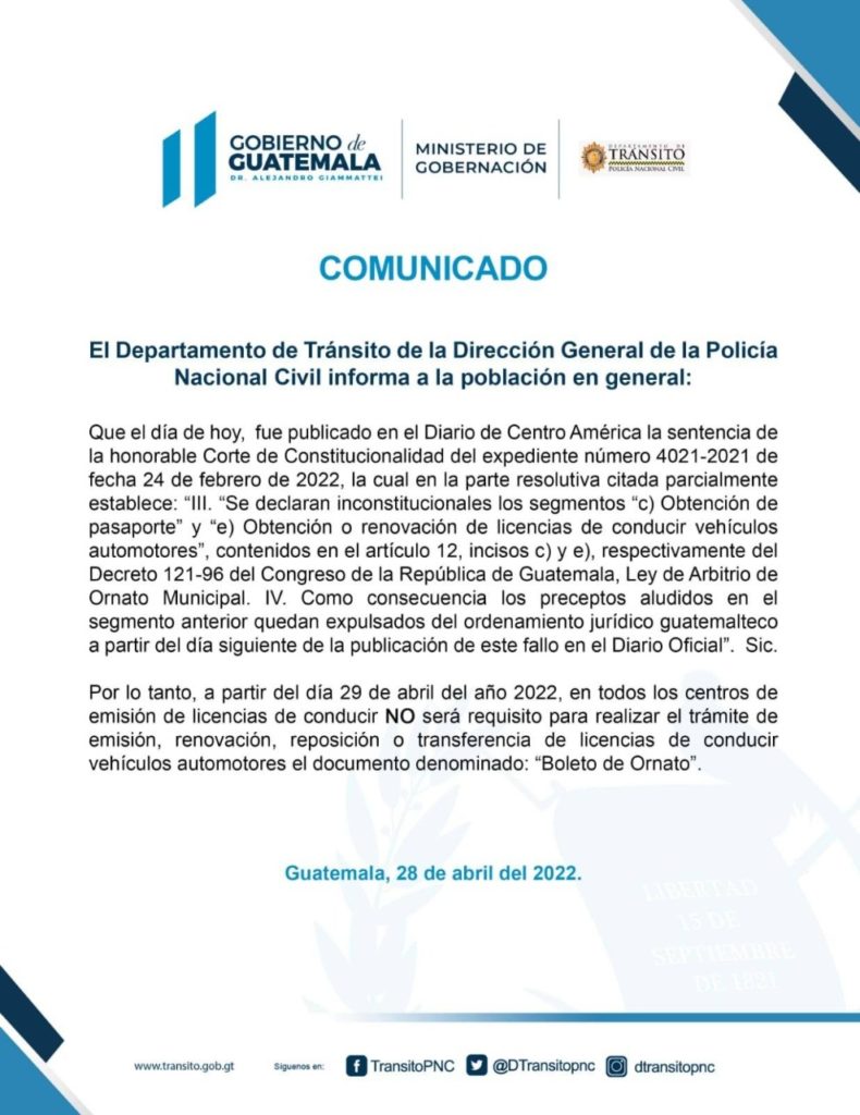 A través de un comunicado publicado está tarde por el Departamento de Tránsito de la Dirección General de la Policía Nacional Civil, se informó que a partir del 29 de abril de 2022, en todos los centros de emisión de licencias de conducir no será requisito el Boleto de Ornato, para realizar el tramite de emisión, renovación, reposición o transferencia de licencia de conducir.
