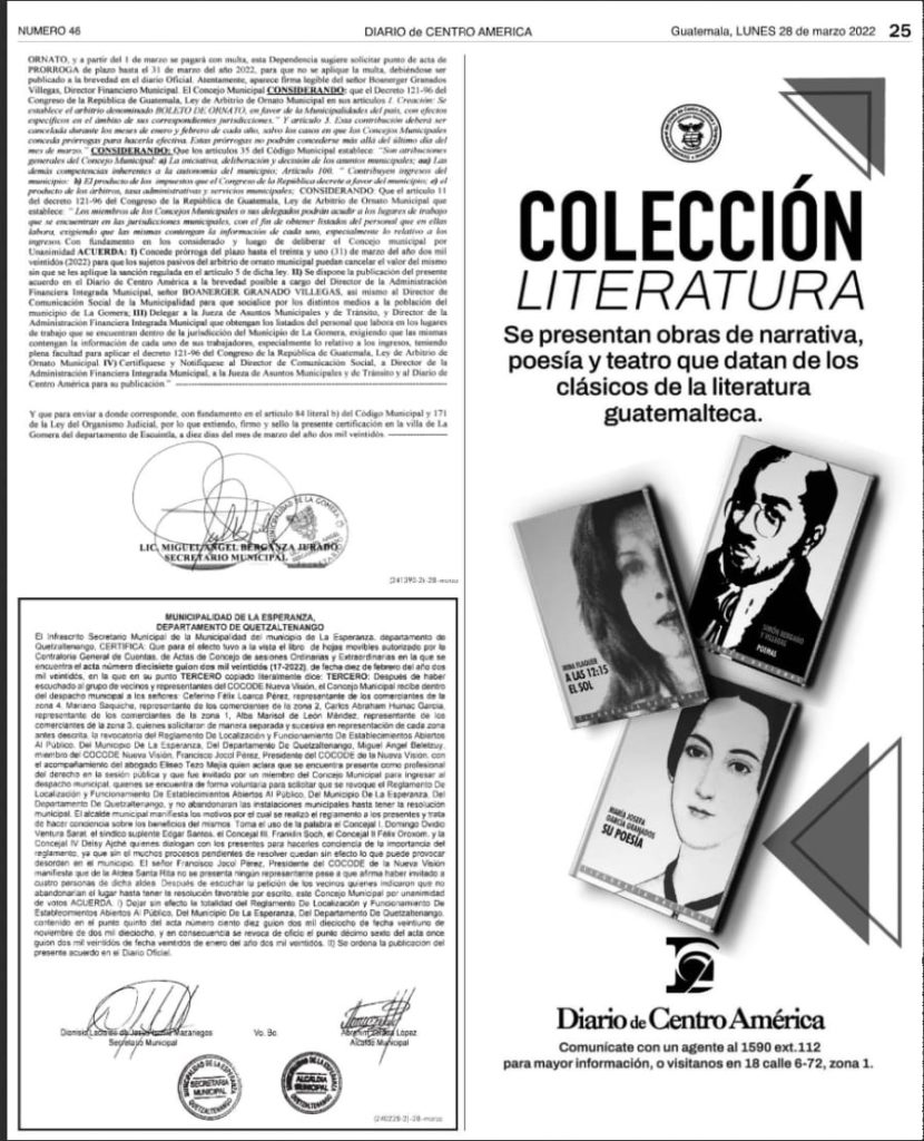 En conferencia de prensa el Cocode Nueva Visión, dio a conocer la publicación oficial en el Diario Centroamérica de la derogación del acta 110-2018 referente al pago de espacios abiertos al público que había impuesto la Municipalidad de La Esperanza, Quetzaltenango. Este cobro quedó sin efecto.
