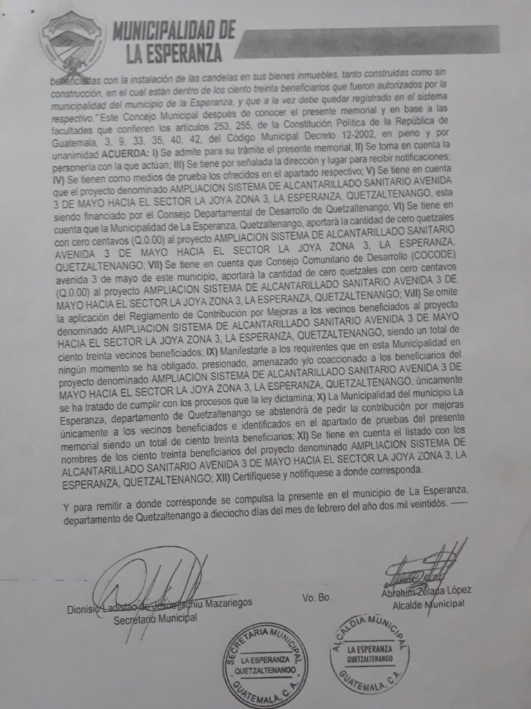 Y al informarse los pobladores de dicho sector, de que no existe ningún reglamento para aportar el 15 % del costo de este proyecto, se unieron con el COCODE Nueva Visión para darle una salida viable y no hacer la contribución económica que les pedía la municipalidad, según mencionó Francisco Jocol en la conferencia de prensa.