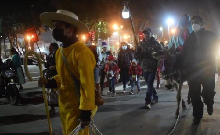 Jóvenes y niños desarrollan la representación de José y María. En las posadas los integrantes de la posada llevan a un asno.