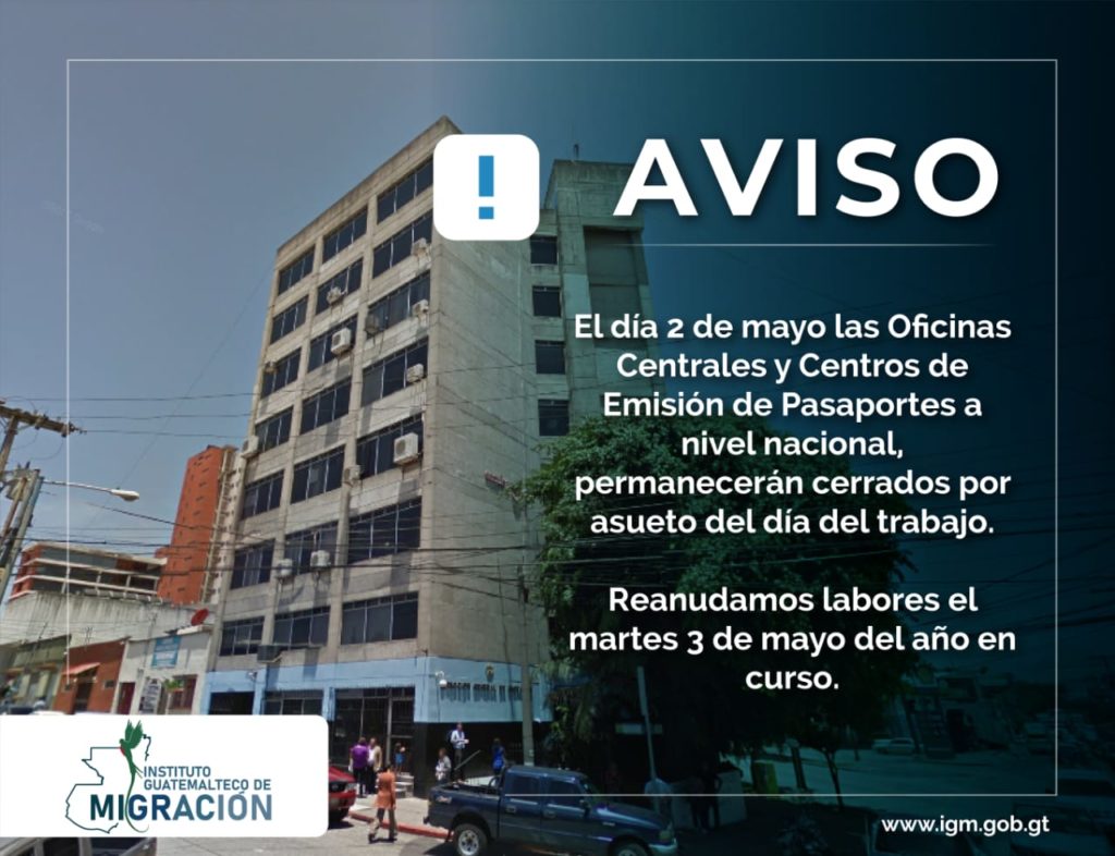 Oficinas centrales y centros de emisión de pasaportes en departamentos estará cerrado el próximo lunes. Reanudan labores el martes.