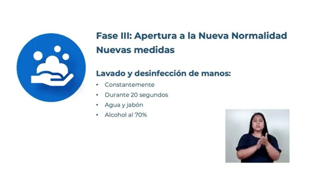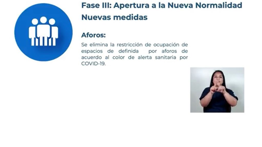 Se elimina la restricción de ocupación en espacios definida por el color de la alerta sanitaria. Por otro lado, continúa la recomendación del lavado y desinfección de manos constantemente, así como la aplicación del gel antibacterial.