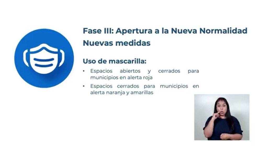 El uso de la mascarilla continuará en municipios que se encuentren en alerta roja por COVID-19 dentro del tablero de alertas. Mientras que en los municipios que se encuentren en alerta Naranjo o Amarilla, su uso obligatorio será en espacios cerrados.