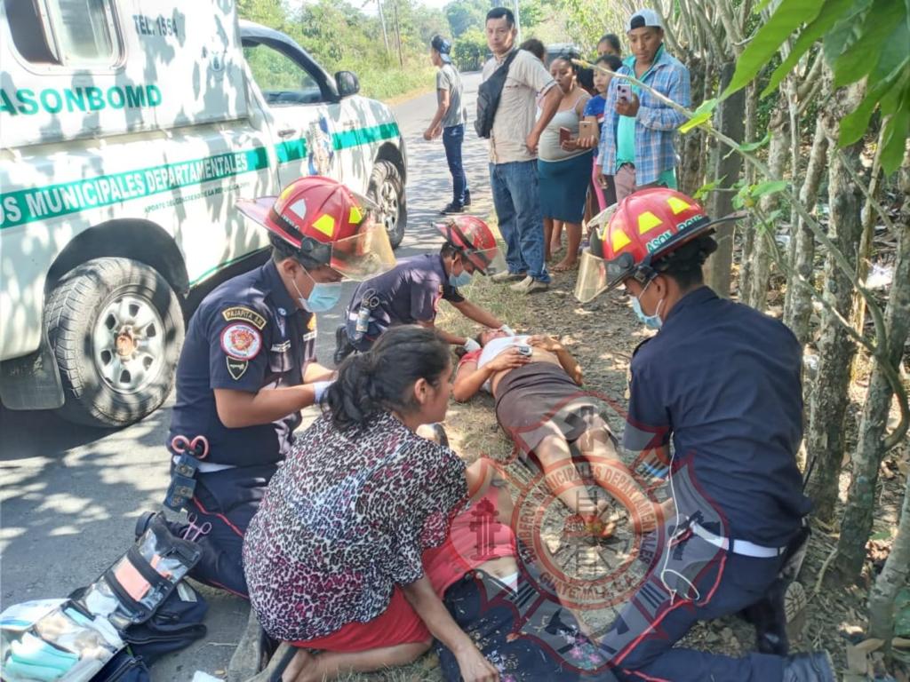 Bomberos Municipales Departamentales de Pajapita, San Marcos, trasladan a dos mujeres, quienes resultaron heridas luego de que el mototaxi en que viajaban volcó.