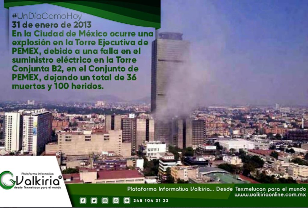 - 2013: en Ciudad de México ocurre una explosión en la Torre Ejecutiva de PEMEX, debido a una falla en el suministro eléctrico (algunos aseguran que fue por acumulación de gas), en la Torre Conjunta B2, en el Conjunto de PEMEX, dejando un total de 36 muertos y 100 heridos.