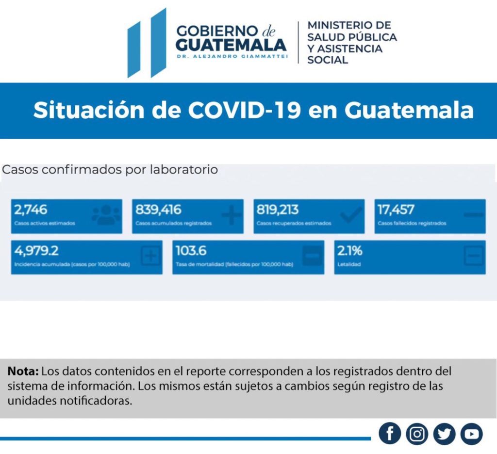 El Minsiterio de Salud informa este 20 de abril de 2022 los casos confirmados por laboratorio en el tablero Situación COVID-19 en Guatemala.