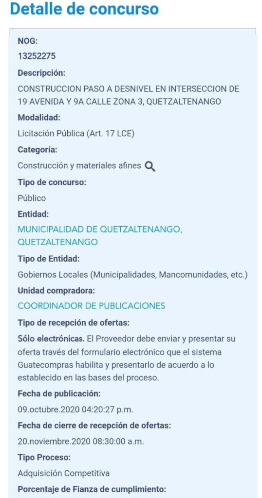 El Número de Operación Guatecompras (NOG) del proyecto da cuenta que se trata de un paso a desnivel, según se observa.