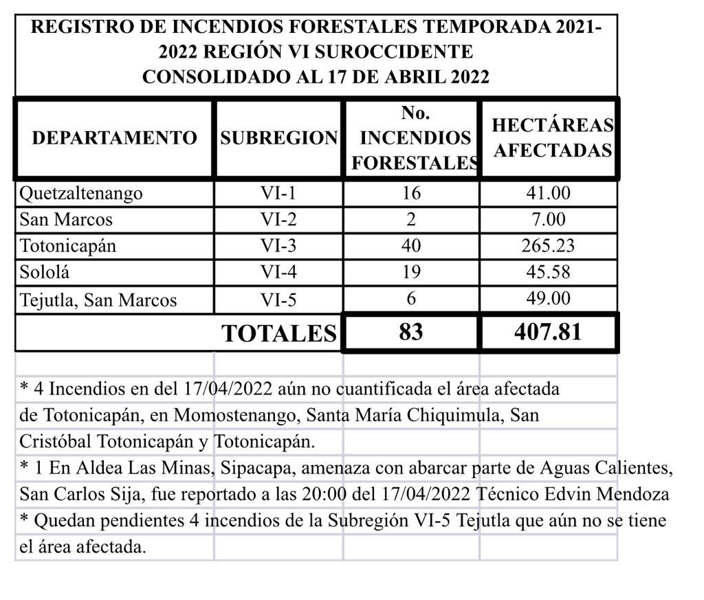 En el SurOccidente de Guatemala, se han reportado durante la temporada un total de 83 incendios forestales , Totonicapán ha sido el más afectado. dio a conocer en sus estadísticas el Instituto Nacional de Bosques (INAB)