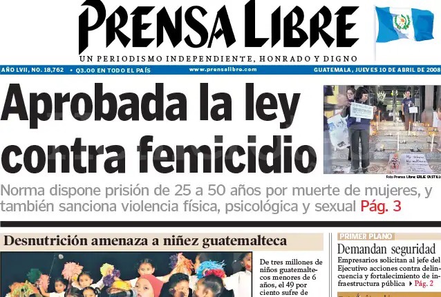 9 de Abril de 2008. Fue aprobada la Ley Contra el Femicidio y otras Formas de Violencia Contra la Mujer.