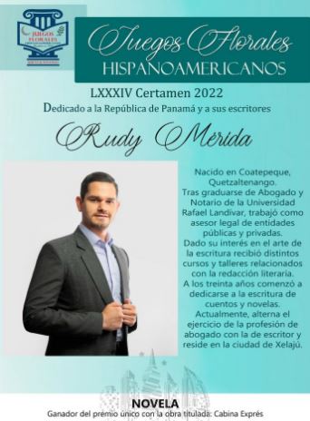 En la rama de novela el ganador es el escritor y abogado, Rudy Estuardo Mérida Cifuentes, originario de Coatepeque, Quetzaltenango, quien presentó la obra Cabina exprés.