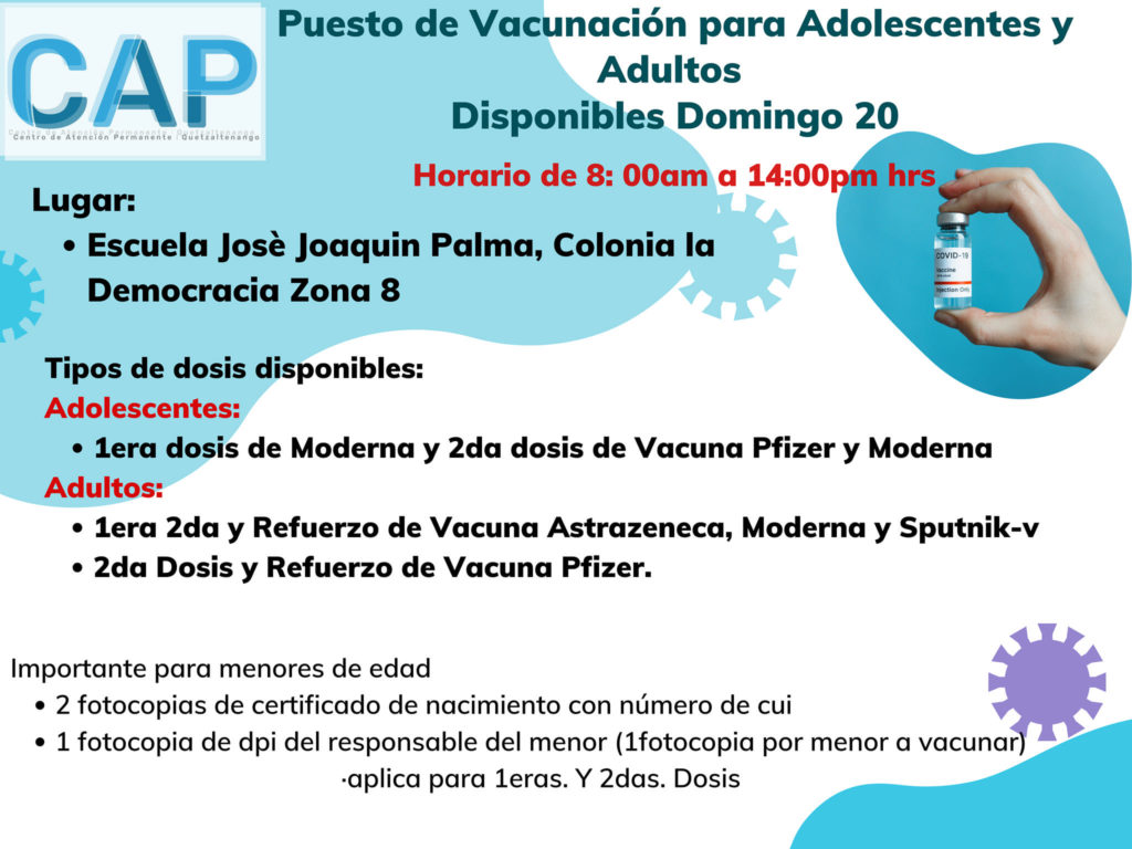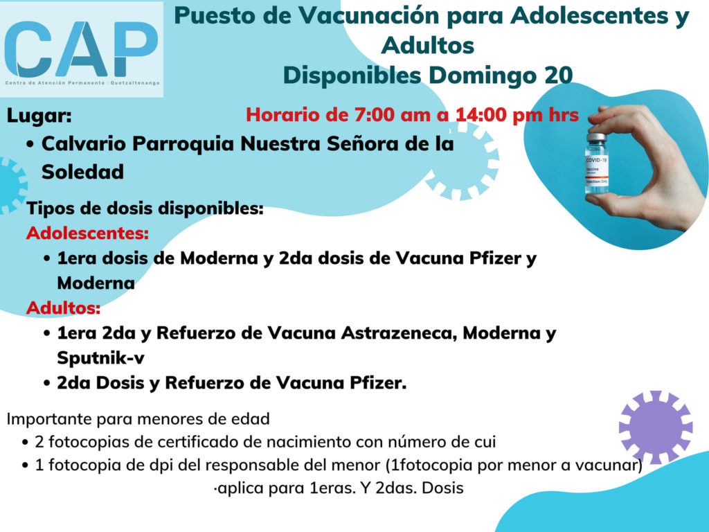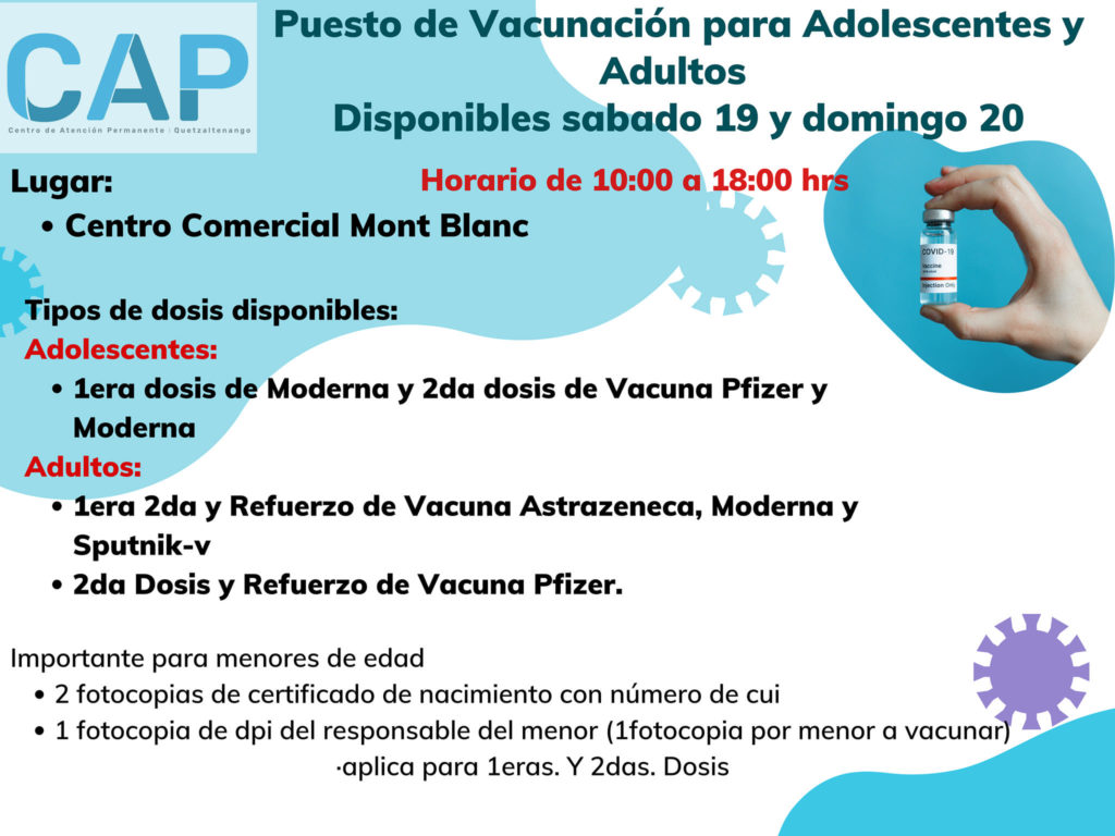 El Centro de Atención Permanente (CAP) informó que serán 04 puestos de vacunación contra COVID-19 habilitados para este 19 y 20 de febrero de 2022, -sábado y domingo-.