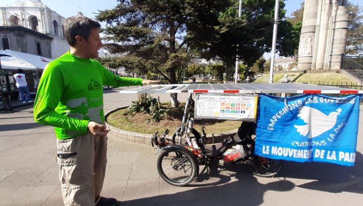 El ciudadano francés, quien se identifica con el seudónimo Pinky Verde y quien es parte de la asociación internacional Bank On The Climate (Banco sobre el clima), se encuentra en la ciudad de Quetzaltenango como parte de su recorrido ecológico en bicicleta.