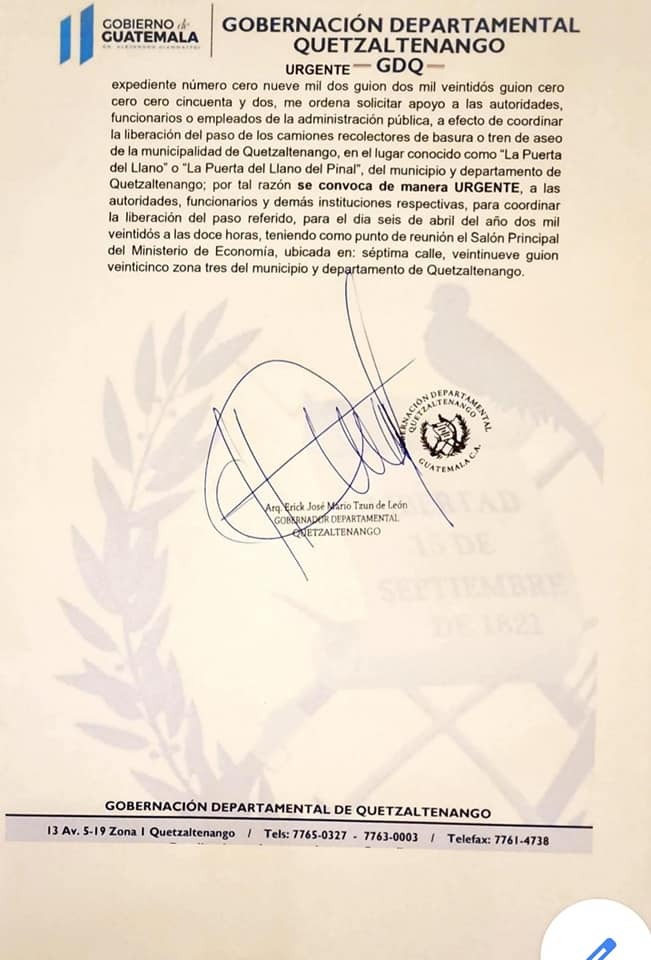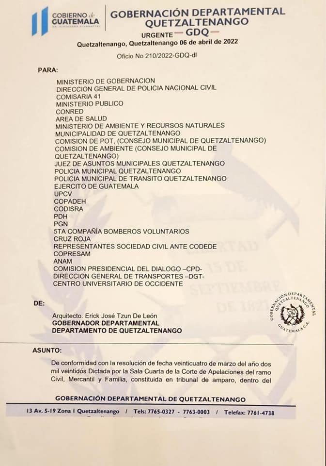 A través de una circular, Gobernación Departamental de Quetzaltenango convocó de manera urgente a las autoridades, funcionarios y demás instituciones para que se le de cumplimiento a una resolución judicial dictada por la Sala Cuarta de la Corte de Apelaciones del ramo Civil, Mercantil y Familia para liberar el paso vehicular.