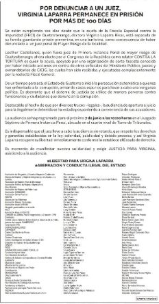 Organizaciones de sociedad civil y defensores de derechos humanos indican que no hay motivos para dejarla presa, porque son delitos que gozan de medidas sustitutivas. Aún se desarrolla la audiencia, en la cual se obstaculiza la presencia de medios de comunicación.