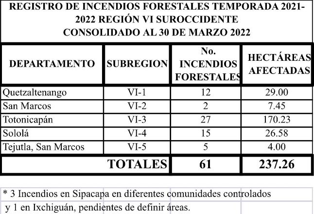 Maynor Pérez, jefe regional del Inab, informa que a nivel nacional durante la temporada 2021-2022 se han registrado 346 incendios forestales, de ellos, 61 en la región —12 en Quetzaltenango—.