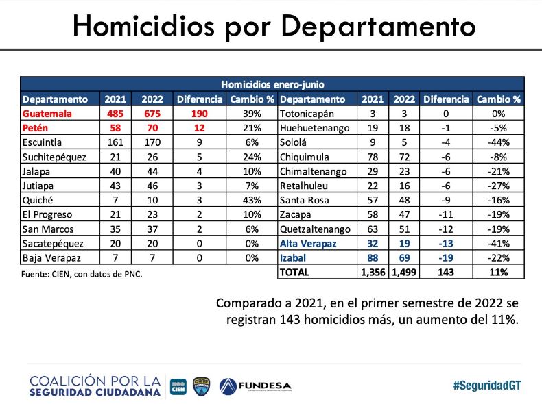 «Llama la atención que en el primer semestre del año Guatemala es el departamento que más aumentó en cantidad de homicidios, así como Petén, y los que más disminuyeron fueron Alta Verapaz e Izabal», indicó Walter Eneas Menchú, de CIEN.