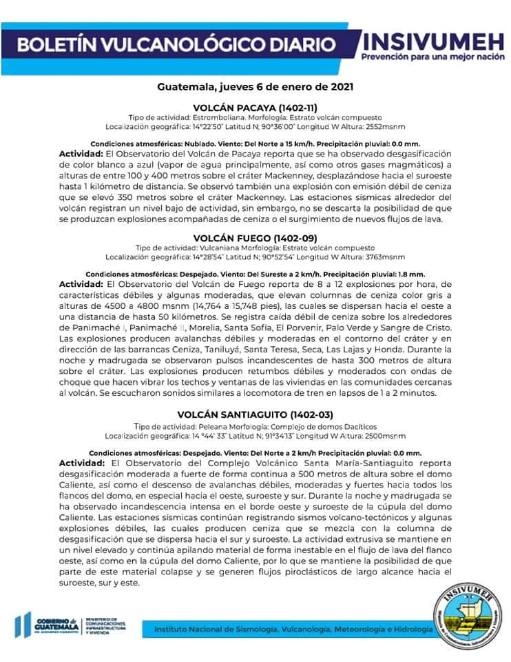 El Instituto Nacional de Sismología, Vulcanología, Meteorología e Hidrología (Insivumeh) informa que sigue con el monitoreo a los volcanes en Guatemala.