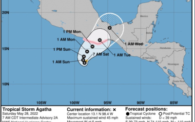 A las 04.00 horas tiempo del centro de México, de este sábado 28 de mayo de 2022, se formó la tormenta tropical Agatha, a partir de Depresión Tropical Uno-E en el Océano Pacífico. Se localizó a 355 kilómetros (km) al sur-suroeste de Puerto Ángel, Oaxaca, con vientos máximos sostenidos de 65 kilómetros por hora (km/h), … Sigue leyendo Insivumeh informa que recién formada tormenta Agatha no representa peligro directo para Guatemala